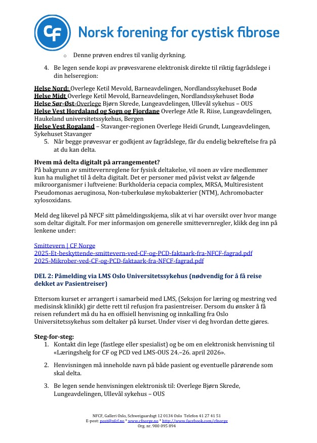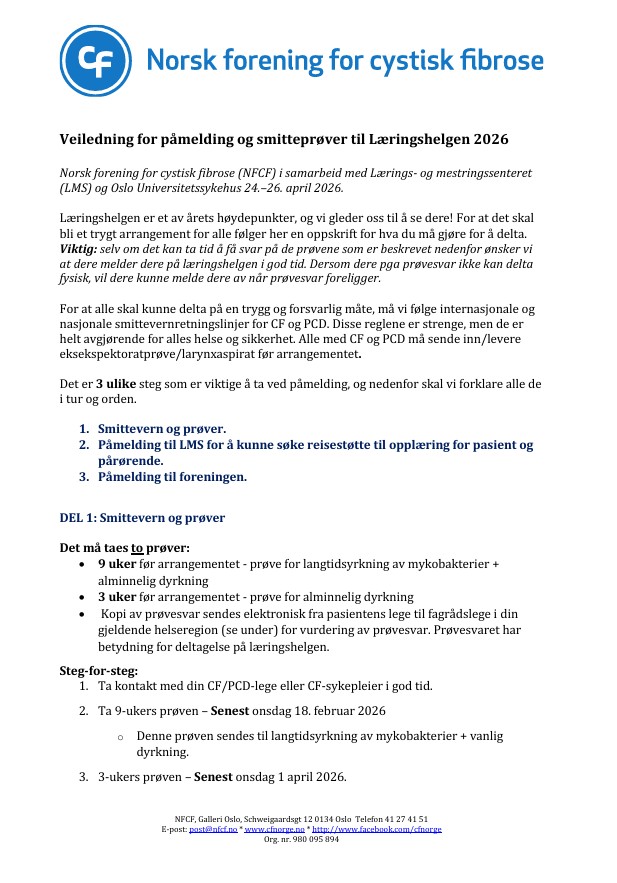 1. Smittevern og prøver: For at alle skal kunne delta på en trygg og forsvarlig måte, må vi følge internasjonale og nasjonale smittevernretningslinjer for CF og PCD. Disse reglene er strenge, men de er også helt avgjørende for alles helse og sikkerhet. Alle med CF og CD må sende inn/levere eksekspektoratprøve/larynxaspirat før arrangementet.